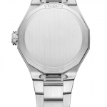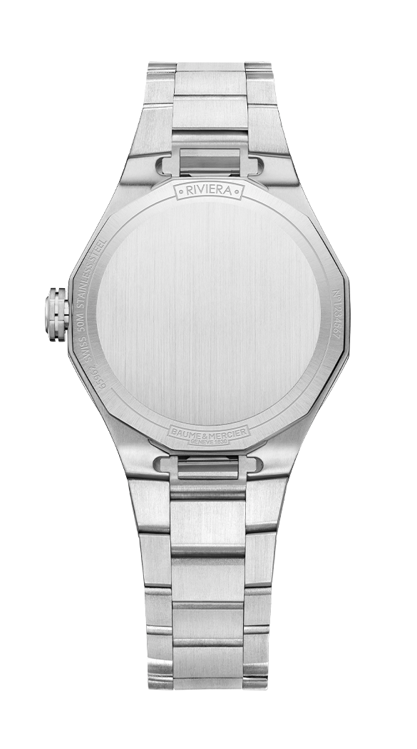 In a 33 mm diameter, Baume & Mercier presents another ultra-feminine Riviera, featuring a quartz movement, a night blue dial, an built-in interchangeable steel strap, and a bezel set with 44 diamonds (brilliant-cut, Top Wesselton, VS quality, 0,47ct) in a snow-setting style, fastened with four screws in polished steel. In this version, the Riviera addresses women seeking a precious watch that is smart, beautiful and simple. An understated luxury that the Maison perfectly masters.